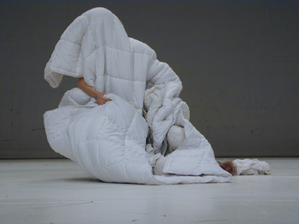 A human figure dressed in a huge white duvet-like costume with no face nor gender assignment evolves slowly within the landscape. While the figure becomes a surface of projection of desire for recognition and identification, it also refuses fixed categorization through a continuous process of transformation. Through time, it evolves in its own figuration by folding and unfolding itself. These investigations of the performer’s body produce a game to question what is there between the "really present" and the "really seen”.